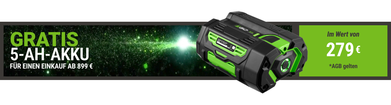 Erhalten Sie einen kostenlosen 5-Ah-Akku (BA2800T) im Wert von 279 €, wenn Sie in einer einzigen Transaktion EGO Werkzeuge im Wert von 899 € oder mehr kaufen. Dieses exklusive Angebot gilt nur bei teilnehmenden autorisierten EGO Händlern vom 01/01/2025 bis zum 31/12/2025 oder solange der Vorrat reicht.
